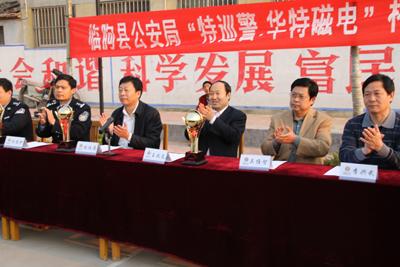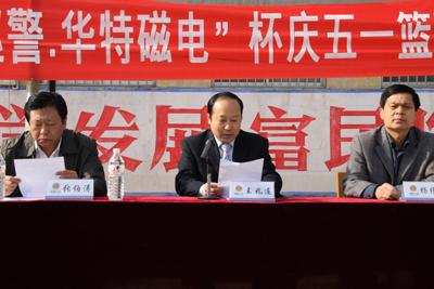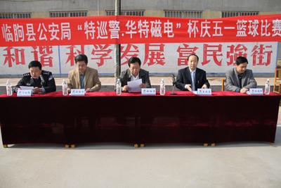 429上午,由公司協辦的臨朐縣公安局“特巡警·華特磁電”杯慶五一籃球比賽在東城區吳家廟籃球場舉行??h公安局政委張伯濤、縣公安局副局長楊維護,我公司董事長兼總經理王兆連出席開幕式。王兆連董事長在開幕式上講話,代表公司向大賽表示祝賀并?;@球賽圓滿成功。