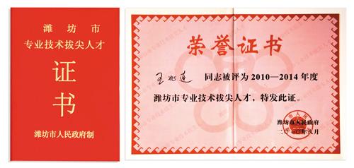 近日,公司董事長兼總經(jīng)理王兆連被濰坊市人民政府評為2010-2014年度濰坊市專業(yè)技術(shù)拔尖人才。