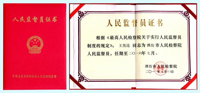 根據濰坊市人民檢察院濰檢發[2011]13號文件決定,公司董事長兼總經理王兆連被選任為“濰坊市人民檢察院人民監督員”。7月29日,參加了濰坊市人民檢察院人民監督員選任大會,會上被授予“人民監督員證書”。