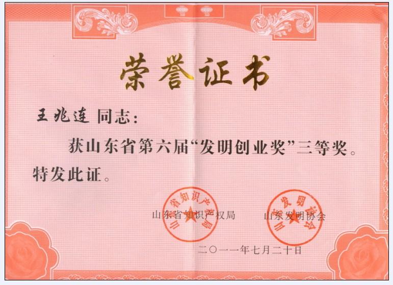 日前,由省知識(shí)產(chǎn)權(quán)局、山東發(fā)明協(xié)會(huì)組織評(píng)選的山東省第六屆“發(fā)明創(chuàng)業(yè)獎(jiǎng)”評(píng)選揭曉,公司董事長(zhǎng)兼總經(jīng)理王兆連獲三等獎(jiǎng)。