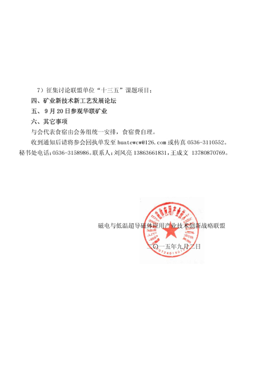 關(guān)于召開(kāi)2015磁電與低溫超導(dǎo)磁體應(yīng)用產(chǎn)業(yè)技術(shù)創(chuàng)新戰(zhàn)略聯(lián)盟年會(huì)暨礦業(yè)新技術(shù)、新工藝發(fā)展論壇的通知