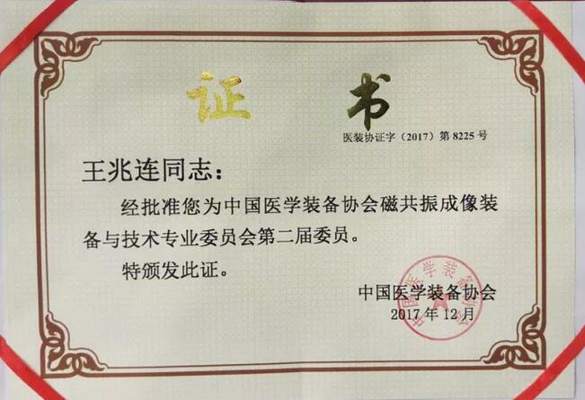 會議由北京大學醫學部科研處處長、學科建設辦公室主任韓鴻賓教授主持,中國醫療裝備協會趙自林理事長、任健監事長、磁共振專委會顧問馮義濂教授、主任委員張云亭教授、常務委員王洪教授等相關領導出席會議。主任委員張云亭教授作第一屆磁共振委員會工作報告并介紹換屆籌備過程,醫學裝備協會任健監事長對換屆選舉過程進行監督并宣布選舉結果。大會一致通過專委會主任委員、常務委員人選,并由中國醫學裝備協會趙自林理事長頒發了證書。濰坊新力超導公司董事長王兆連當選本屆中國醫學裝備協會磁共振成像裝備與技術專業委員會委員。