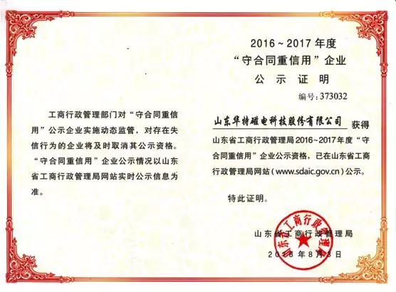 山東華特磁電科技股份有限公司被認(rèn)定為2016-2017年度山東省守合同重信用企業(yè)