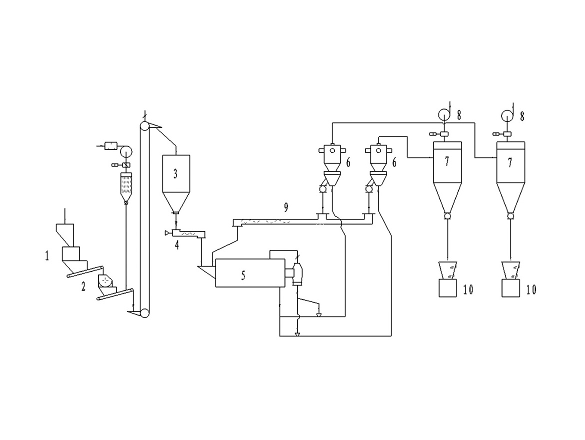 整套分級裝置由氣流分級機、旋風收集器、脈沖除塵器、高壓引風...